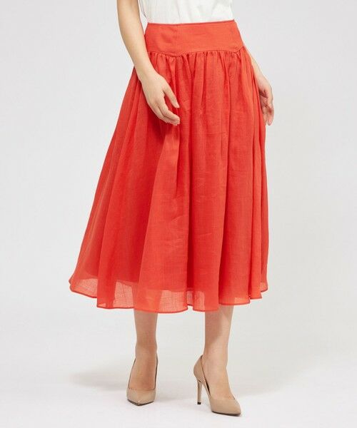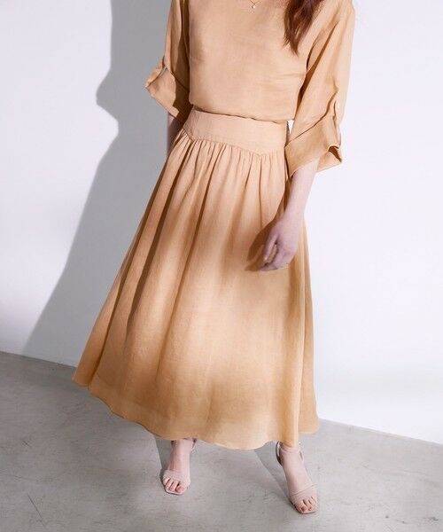 カーブのヨーク切り替えがポイントのギャザーフレアスカートです。程よいフレア分量で上品に仕上げました。後ろウエストにはゴムが入っており、着心地も良い1着です。同素材のブラウス(品番:M5M24555)とセットアップでも着用いただけます。