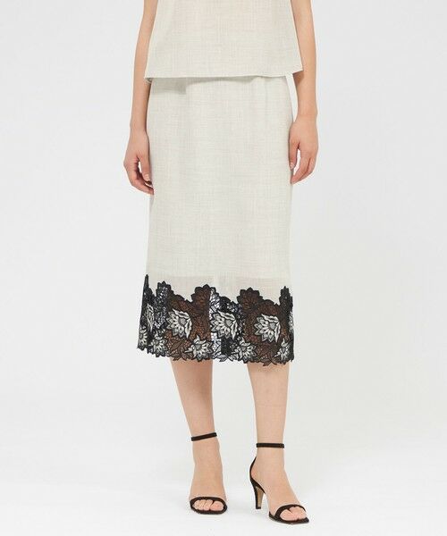 裾にケミカルレース刺繍を施したタイトスカートです。後ろウエストはゴム入りで快適な着心地でありながらも、足元が品よく透けてエレガントな印象に。同素材のブラウス(品番:M5M30569)とセットアップで合わせれば、オンシーンにも対応出来る綺麗めなコーディネートが完成します。