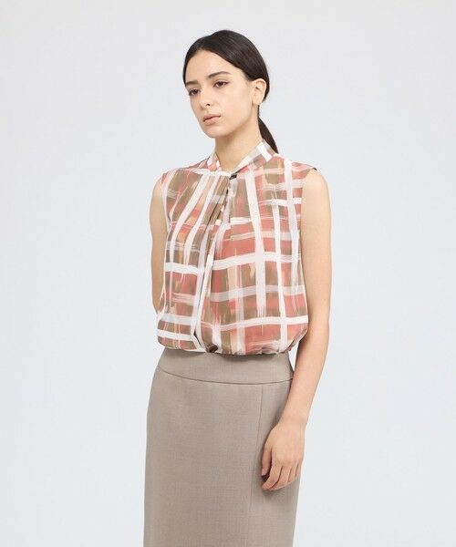 オリジナルチェック柄プリントのシフォンブラウスです。スタンドカラーから裾に向かって流れるタイ風のドレープがエレガントな印象を与えます。ジャケットのインナーとしても活躍する1着です。