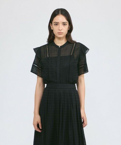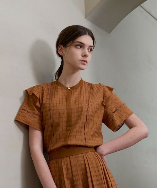 格子柄のカラミ素材に梯子レースをドッキングしたブラウスです。前立てと襟は無地の素材を使用し、コントラストを効かせました。袖のフリルディテールがポイントです。同素材のスカート(品番:M5S41602)を合わせた上品なセットアップスタイルはもちろん、デニムやパンツと合わせたカジュアルなコーディネートもおすすめです。