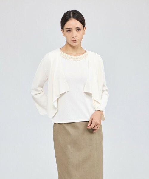 ニットカーディガンは、襟の波打つようなデザインが優雅な印象。ジャケットほど堅くなく、カーディガンよりきちんと見えて、使い勝手が良いです。インナーのニットは、襟元の装飾がポイント。ジャケットのインナーにもオススメ。スカートは、程よい厚さのでハリがありキレイにシルエットが決まります。【モデル身長:156cm】