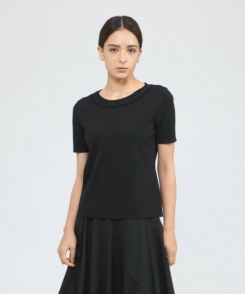光沢のある太番手の糸とラメ糸で作ったトーションレースを襟元にあしらった半袖プルオーバーです。華やかさと上品さを兼ね備えたデザインで、同素材のカーディガン(品番:M5N22611)とのアンサンブルはもちろん、ジャケットインにも活躍する1枚です。