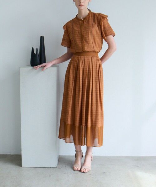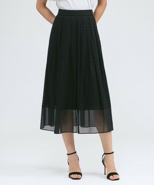 ウエストのランダムなタックがポイントのフレアスカートです。シンプルなシルエットながらもカラミ素材の表情が映えるデザインです。裾は無地シアー素材で切り替え、軽やかに仕上げました。同素材のブラウス(品番:M5M34602)とセットアップで着用いただくのもおすすめです。