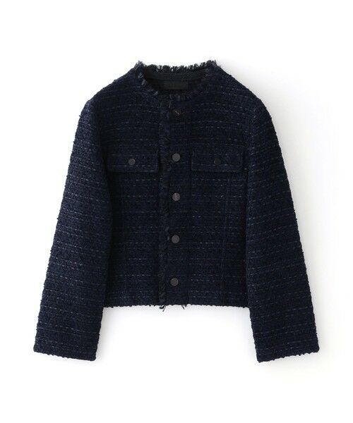COOHEMの代名詞であるニットツイードの定番ノーカラージャケット。