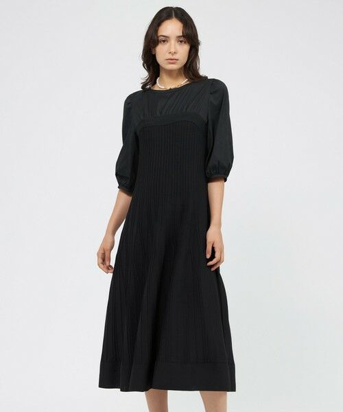 【素材】高密度なストレッチ素材です。ポリエステルならではの軽やかさと程よい張り感が特徴で、優れたキックバック性により快適な着心地を実現しています。上身頃の布帛部分には発色性とキックバックに優れた着心地の良いシャツ素材を使用しています。【デザイン】コットンストレッチブロードを上身頃と袖に使用したニットコンビドレスです。引き返し編みを駆使したフィット&フレアの美しいシルエットが魅力です。ニット部分はミラノリブをベースに、表目と裏目を利用し凹凸のあるライン柄にしています。ブロード部分にはギャザーを効果的に施し、ブラウスのような軽やかな仕上がりに。同素材のカーディガン(品番:M5N28621)との合わせもおすすめです。ご自宅で手洗い可能です。洗濯表示に従ってお手入れしてください。透け感:なし伸縮性:あり生地の厚さ:普通おすすめ着用期間:春、夏、秋※この商品はサンプルでの撮影を行っています。実際の商品とイメージ、仕様が異なる場合がございます。
