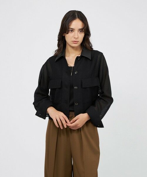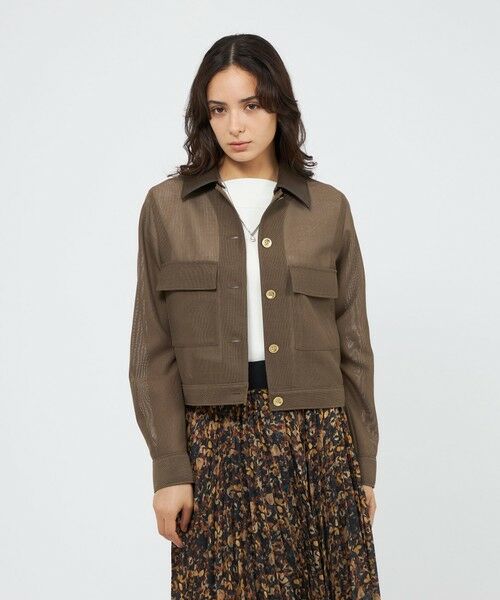 襟部分にレザー素材を使用したシアーブルゾンです。クロップド丈のボクシーシルエットが特徴で、スカート合わせやドレス合わせに活躍します。秋らしい深い色味でありながらも程よい透け感があり、重くなりすぎず軽やかに着用いただけます。襟は取り外し可能で、コーディネートに合わせて自在にアレンジを楽しめるのも魅力の1つです。