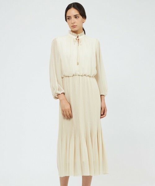 【素材】しなやかで柔らかな風合いが魅力のジョーゼット素材です。程よいストレッチ性があり、身体の動きに自然にフィットします。さらに強撚糸を用いることで、ドライなタッチとさらりとした肌離れを実現。上品で繊細な表情を持つ本格的なジョーゼットに仕上がっています。【デザイン】シアーなジョーゼット素材がエレガントなプリーツワンピースです。細やかなプリーツ加工とフィット&フレアのシルエットがエレガントな雰囲気を演出します。フリルカラーと胸元のリボンディテールが華やかさをプラスし、オケージョンにぴったりな1枚です。ご自宅で手洗い可能です。洗濯表示に従ってお手入れしてください。透け感:袖、裾あり伸縮性:なし生地の厚さ:薄いおすすめ着用期間:春、秋※この商品はサンプルでの撮影を行っています。実際の商品とイメージ、仕様が異なる場合がございます。