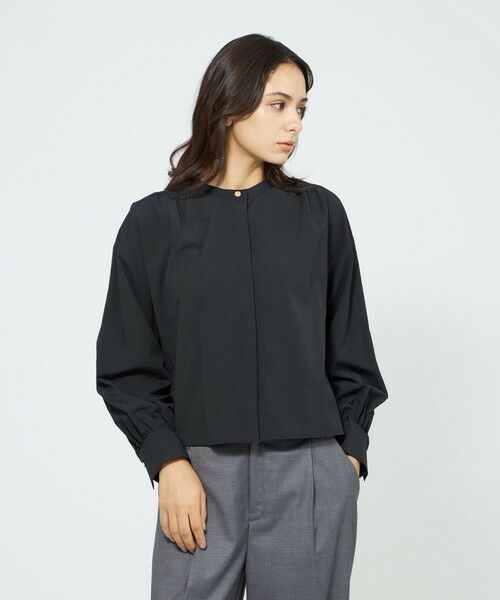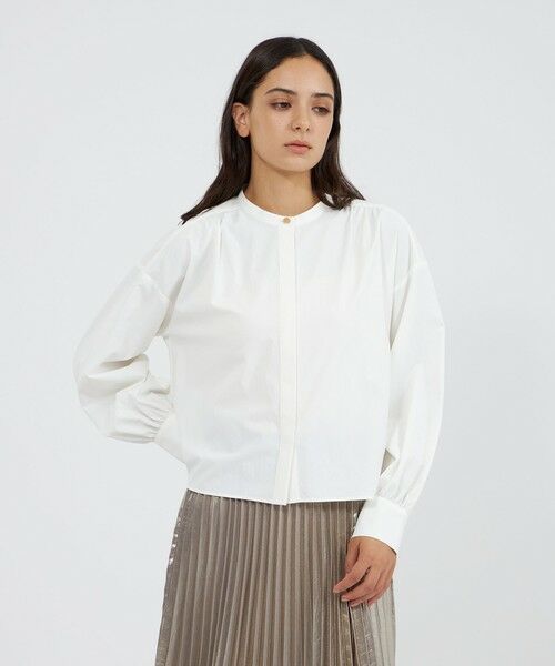 STORIA定番のクロップドブラウス。アクセントとして襟と袖にゴールドボタンを加え、ブラッシュアップしています。コーディネートに抜け感の出る、コンパクトシルエット。