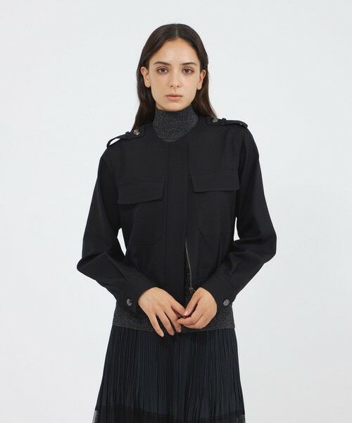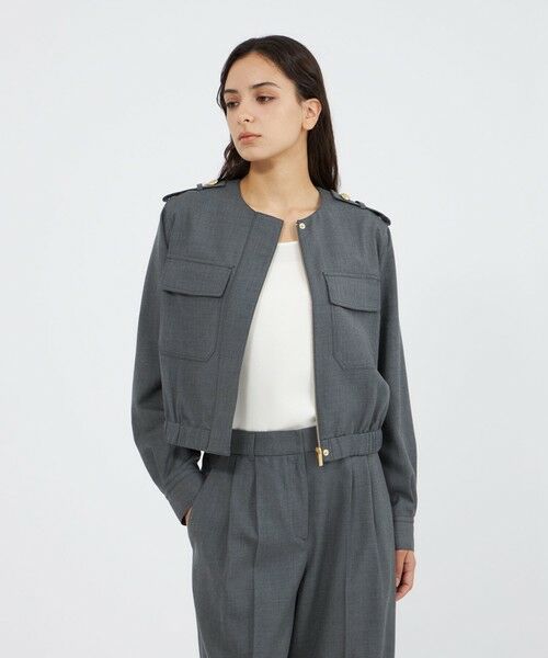 グレーのボディにはゴールドボタンを、ブラックのボディにはにはブラックニッケルボタンをあしらい、細部まで洗練されたデザインに。肩のエポレットはミリタリーのエッセンスを感じさせつつも、エポカならではのなめらかな質感とほのかな光沢感により、上品でエレガントな印象を演出します。同素材のパンツ(品番:M5R27627)とセットアップで着用いただけます。