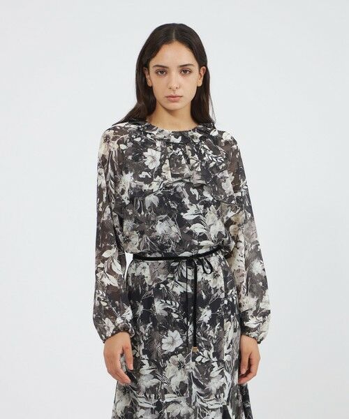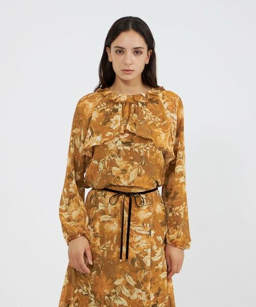 襟元と身頃にふんだんにフリルをあしらったデザインブラウスです。同素材のスカート(品番:M5S29629)と合わせてドレス見えのコーディネートはもちろん、パンツとの合わせもおすすめです。