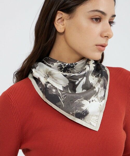 【素材・デザイン】レイヤードされたフラワープリントが華やかに映える、シルクスクエアスカーフです。薄手のシルクツイルを使用し、コートインでも襟元にすっきりと収まります。首元に巻き付けるのはもちろん、バッグに添えるだけでもスタイリングのアクセントに。汎用性の高いサイズ感で、日常から特別なシーンまで幅広く活躍します。※この商品はサンプルでの撮影を行っています。実際の商品とイメージ、仕様が異なる場合がございます。
