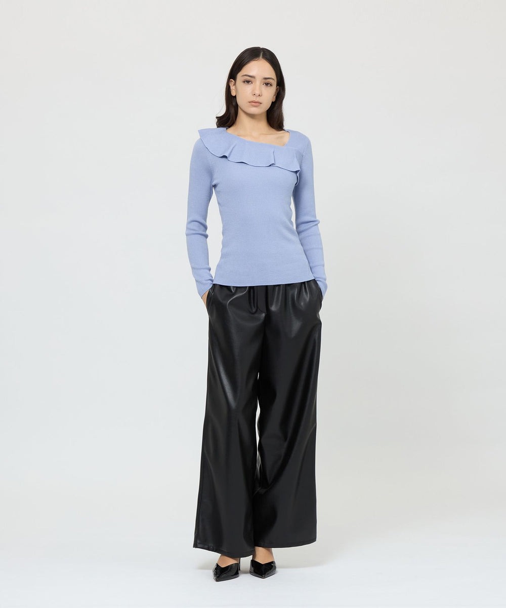 【ニット】斜めに流れるラッフルとデコルテ開きが華やかなリブニットプルオーバー。綺麗なドレープ、立体的なラッフルが出るよう、引き返し編みを駆使しました。【パンツ】シンセティックレザーのパンツです。程よいハリ感と艶のある質感が洗練された印象でコーディネートに変化をプラスしてくれます。