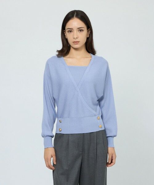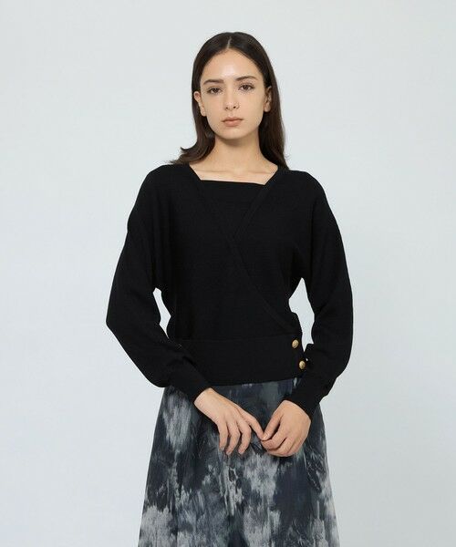 レイヤード風に仕立てたカシュクールデザインのリブニットプルオーバーです。胸元は総針編みで変化をつけ、一枚仕立てでありながらもインナーを重ねているかのようなデザインに仕上げています。太幅の裾リブ部分にはゴールド釦をあしらいアクセントにしました。シンプルなボトム合わせでもコーディネートが華やぐ、着映えトップスです。