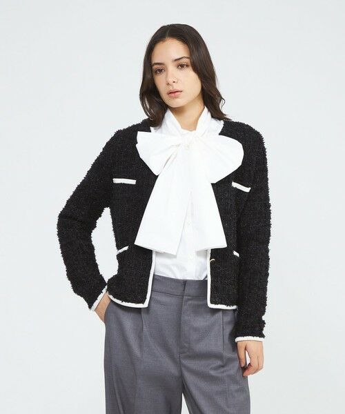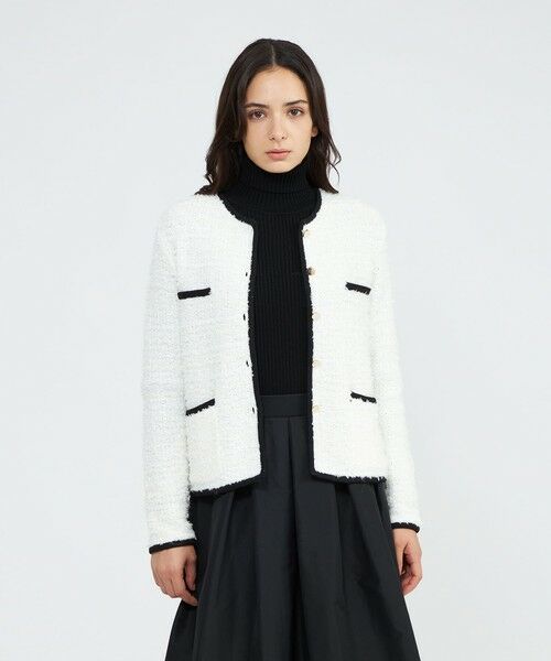 ※こちらは、EPOCA THE SHOP店舗とWEB限定商品です。【EPOCA STORIA】新しい一日のストーリーに華やかな彩りを加えて。シルエットの美しさやディティールの繊細さはEPOCAのフィロソフィーをそのままに、今を生きる女性の日常に寄り添ったコレクションです。【素材】ふわふわと柔らかな毛足のあるツイード調ニット。ツイードの上品なイメージと、ニットならではの軽い着心地を兼ね備えています。【デザイン】トリミングを施した、バイカラーデザインのノーカラージャケット。ボウタイブラウスなどを合わせエレガントに、デニム合わせでカジュアルに、幅広いテイストで活躍するアイテムです。透け感:なし伸縮性:あり生地の厚さ:普通おすすめ着用期間:春、秋、冬※この商品はサンプルでの撮影を行っています。実際の商品とイメージ、仕様が異なる場合がございます。