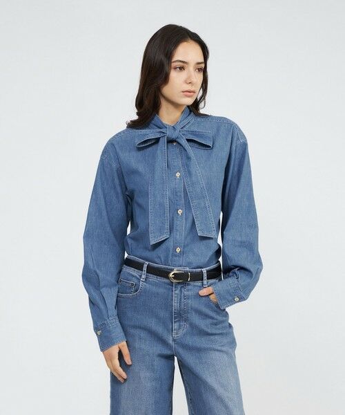 トレンド感のあるデニム素材で仕立てたボウタイブラウスです。綺麗めのボウタイブラウスとは一味違う、カジュアルさと上品さを兼ね備えた1着です。配色ステッチがアクセントになり、デニムならではの表情を引き立てます。ボウタイは取り外し可能で、外せばシンプルなバンドカラーブラウスとしても着用可能です。