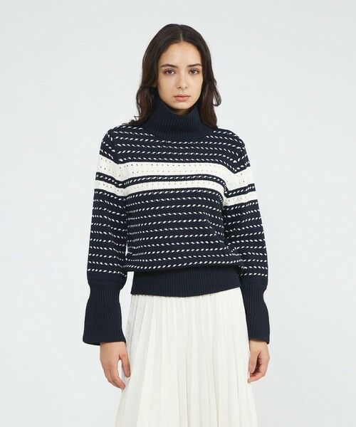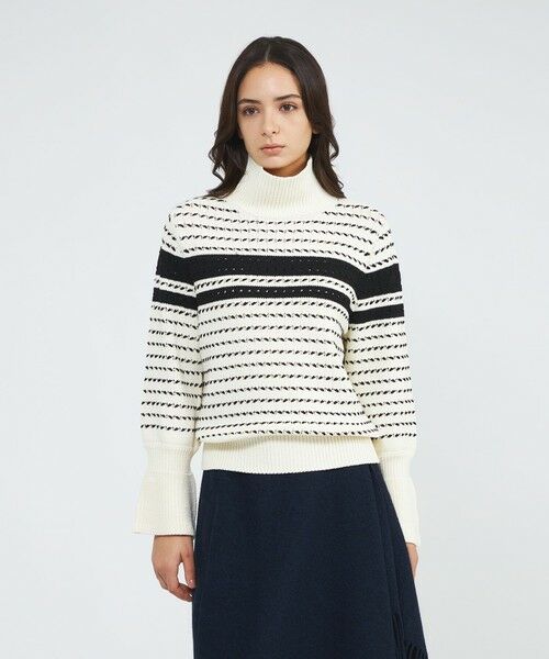 上質なテクスチャーを取り入れたボーダーデザインのニットプルオーバーです。繊細なピッチのボーダーに大胆なラインボーダーを重ね、カジュアルすぎない上品なボーダーに仕上げました。袖口には畦編みを施し、ふわりと広がるシルエットがエレガントさとデザイン性をプラスします。