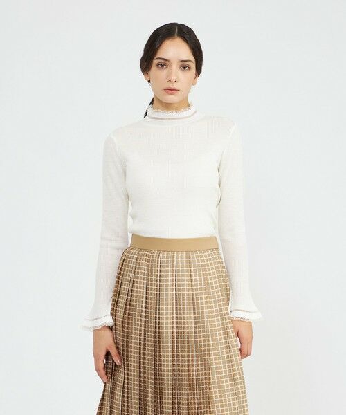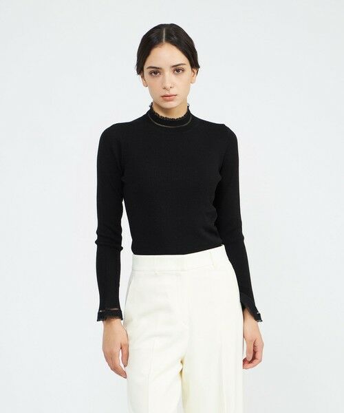 襟元と袖口のフリルが上品なリブニットプルオーバーです。細い透明糸が繊細なフリルを美しく表現し、さりげない華やかさを添えます。軽くてしなやかな着心地、ウールの暖かさを備えており、同素材のカーディガン(品番:M5N58679)とのアンサンブルや、ジャケットのインナーにもおすすめです。