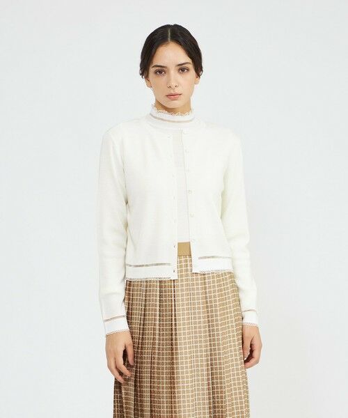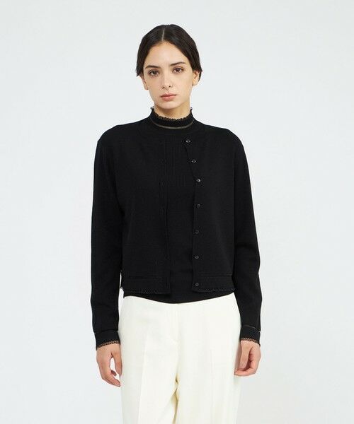 コンパクトなクルーネックのニットカーディガンです。裾と袖口には透明糸で繊細なラインをデザインし、上品なコントラストを加えました。同じテクニックを使った素材のプルオーバー(品番:M5N57679)とアンサンブルで着やすいよう、総針編みでシンプルに仕上げています。