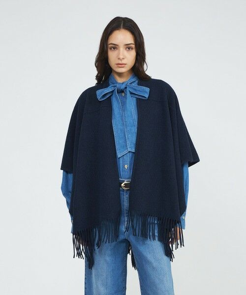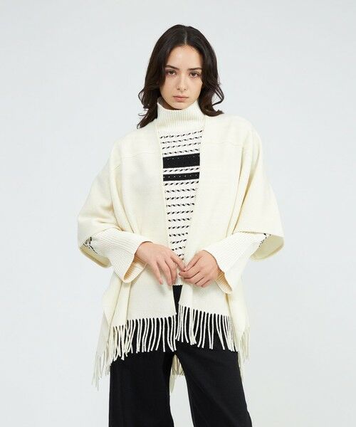 :裾にフリンジをあしらったニットケープ。サイドはゴールド釦で留まっており、ジレのように羽織っていただけるアイテムです。分量があるのでさっと羽織れ、コートを着用する手前にとても重宝するアイテムです。同素材のニットプルオーバー(品番:M5N53666)や同様のフリンジディテールをあしらったプルオーバー(品番:M5N52666)、スカート(品番:M5S43666)とコーディネートいただくのがおすすめです。
