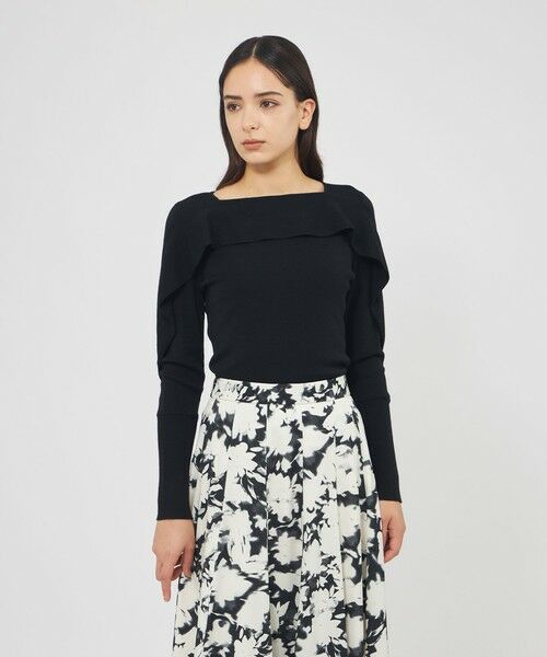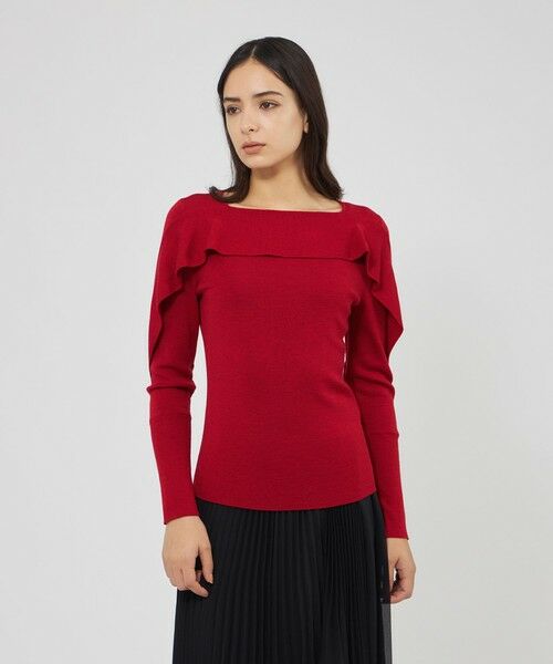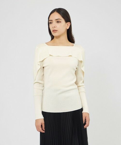 肩から袖にかけてあしらわれたラッフルが華やかさを添えるニットプルオーバー。リブ編みのニットテープで作られたラッフルラインが立体的なシルエットを美しく表現します。繊細な引き返し編みを取り入れ、自然な波打ちと上品な動きを演出しました。目の詰まった美しい表面感が特徴の16ゲージ総針編みでエレガントな表情に仕上げています。
