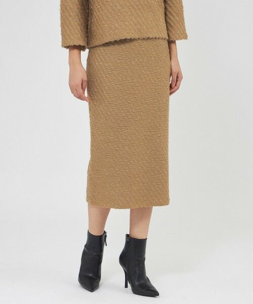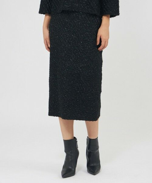 ラメフリンジの華やかなテキスタイルを生かし、シンプルに仕上げたタイトスカートです。スッキリとした美しいシルエット、ニットならではの着心地の良さが魅力です。同素材のニットプルオーバー(品番:M5N60622)とセットアップで着用すれば存在感のあるスタイリングに。単品でも主役になる1着です。