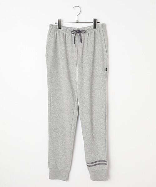 綺麗なテーパードシルエットのリブパンツです。軽く柔らかなダンボールニットを使用しているのでリラクシングウエアとして最適です。左足の光沢感のあるテープがアクセントになり、スエット感を軽減しています。