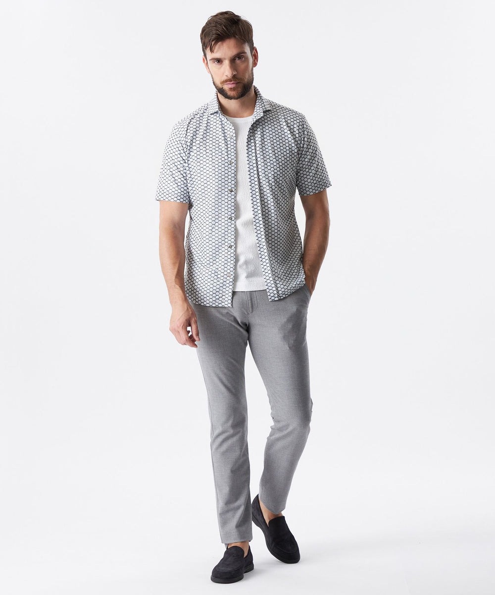 オリジナルのジオメトリック柄が特徴のカジュアルシャツ。 メッシュ素材ならではのストレッチ性の良さと通気性の良さが特徴。 パンツはな快適な着心地なのでテレワークにもおすすめの一着。ひんやりと涼しい接触冷感機能もあるので真冬以外の3シーズンで着用できます。