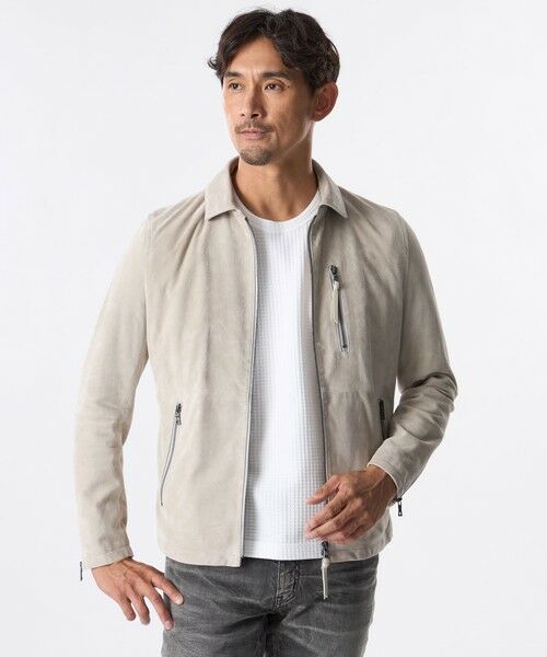 ハードなイメージになりがちなライダースジャケットを、ナチュラルで優しい印象のエクリュ色のスエードにのせ、モダンで上品な印象に昇華。