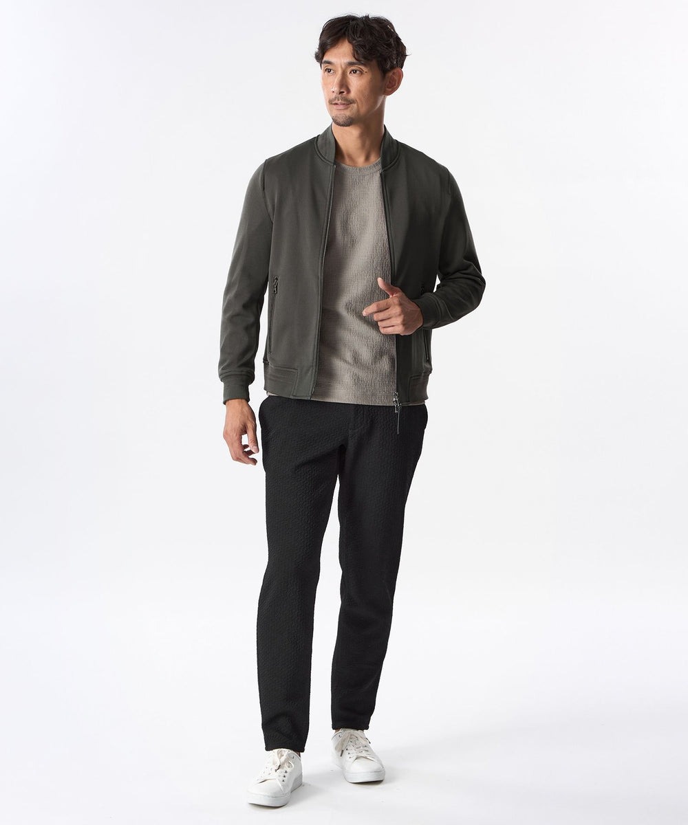 【ブルゾン】合繊ジャージー素材なので綿に比べて軽く、シワになりづらく、この時期に重宝するアイテム。Tシャツ合わせで、デニムやドローコードパンツとのコーディネートがおすすめ。【パンツ】ポリエステルを丁寧に編み上げ、仕上げまで尾州で生産したジャージー素材を使用。