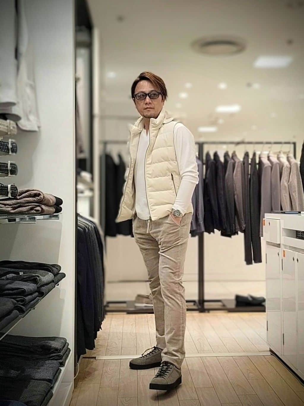 タカです。イケオジを目指すファッションのご提案をしています。 今回はダウンベストのご紹介です。 ベロアツイルジャージー生地を使用しています。前身とフードにダウンを使い、後ろ身はポリエステルニットを配し、車の運転時にも快適に、着ぶくれを防ぐなどの利便性のあるデザインになっています。【モデル身長:173cm】