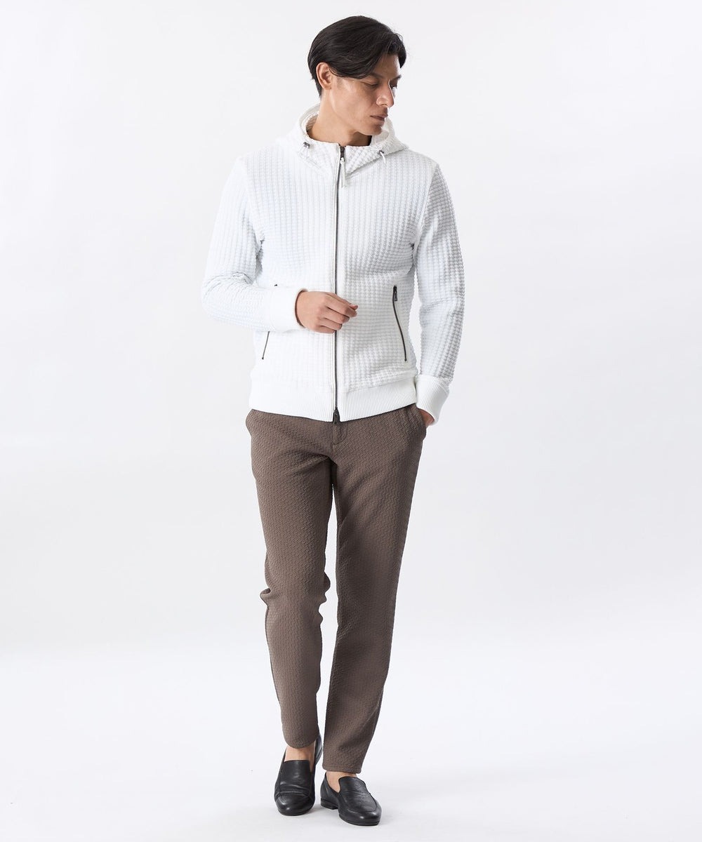 裁断縫製で仕立てたニットパーカ。パターンを活かした立体的な仕上がりが特徴で、なんといっても存在感抜群の編み柄が秀逸。