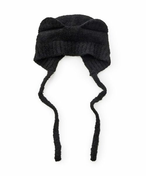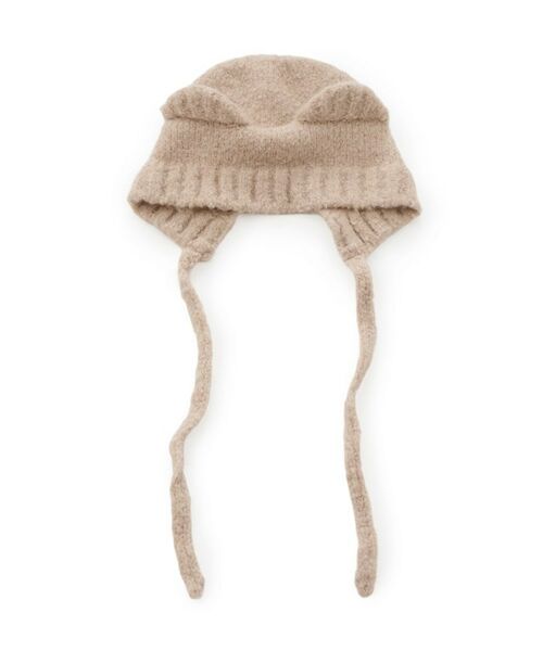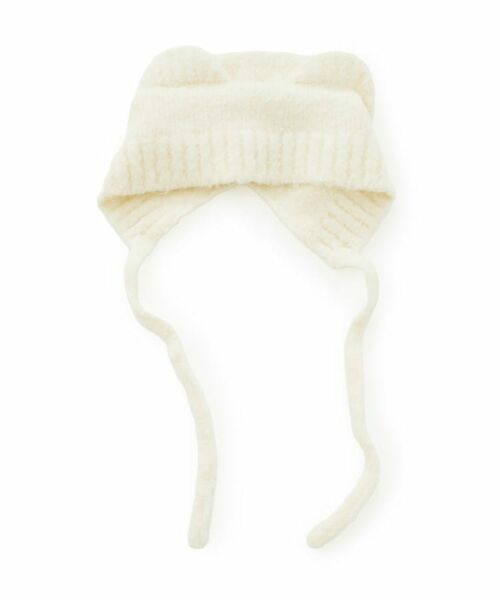 クマ耳デザインのニット帽。長めの紐で結んでも垂らしてもかわいい。
