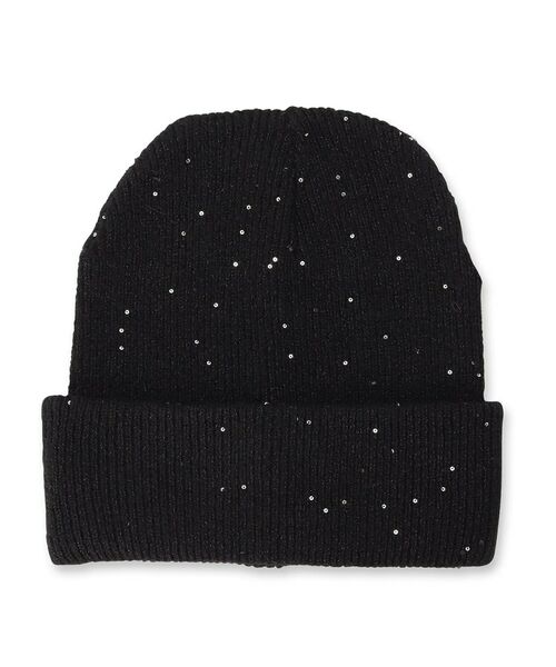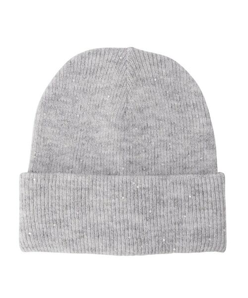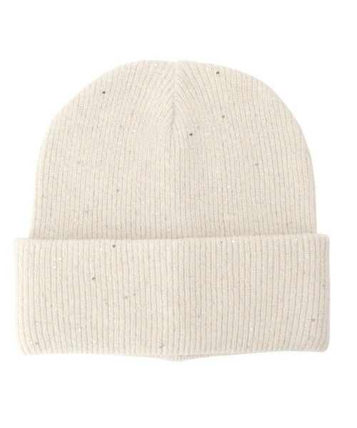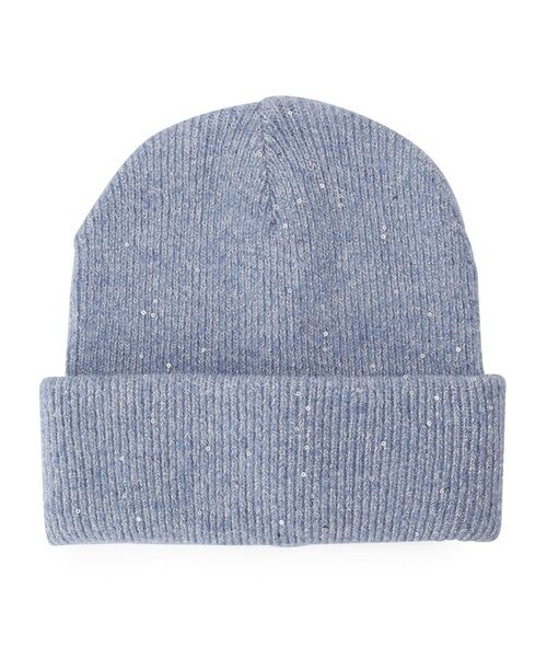 小さなスパンコールが散りばめられた、ラメ入り糸を使用したニット帽。