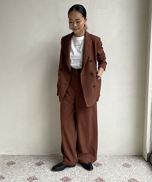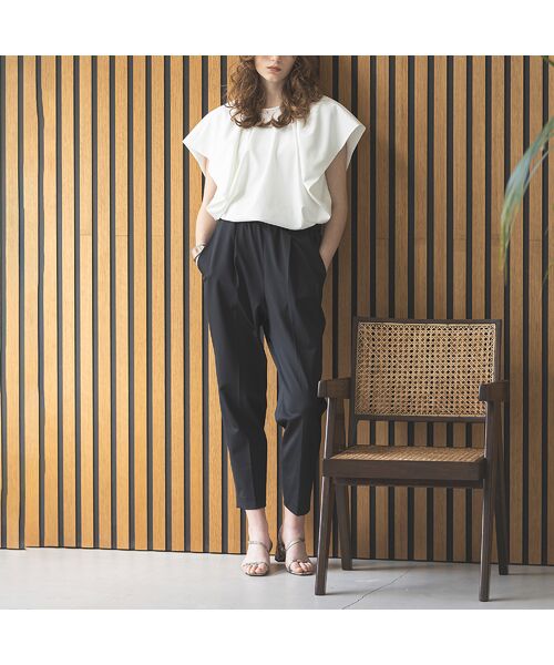 トップスは腕周りが隠せるボリュームのあるデザイン、ボトムはすっきりテーパードシルエットなので、一枚でバランスよく着用できます。 シワも気にならず、どんなシーンでも着回しやすいアイテムです。肌寒い季節にはジャケットやブルゾンを羽織り、ロングシーズン活躍しそうです。