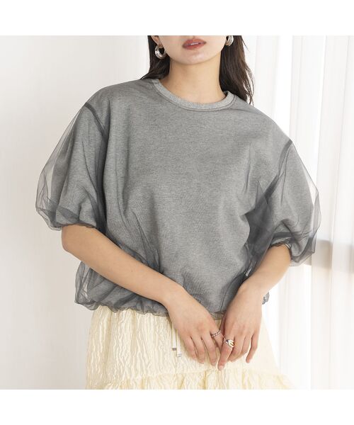 チュールとスウェットがレイヤードされたデザイントップス。