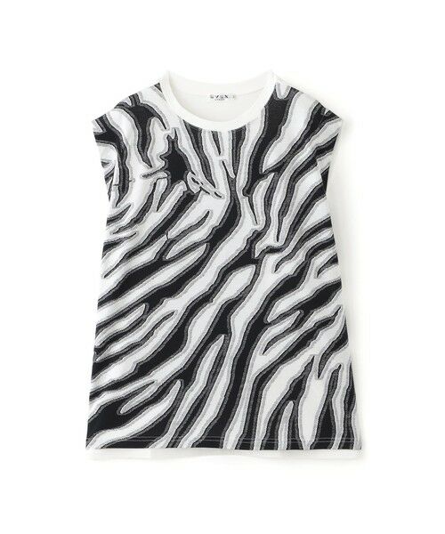 【L】【カタログ掲載品】【ウォッシャブル】アニマルカットジャカードノースリーブカットソーこちらはラージサイズです。肩先が隠れる袖丈のノースリーブトップス。ボクシーなシルエットでシャープな印象です。さらに肩先を内側に折り込んだ流れで身頃が内側へ入るので、脇下が丸見えにならないように工夫されています。(ラージサイズは肩のタックが無くなります。)【素材】ジャカード編みでタイガー柄を大胆に表現した天竺素材。柄をジャカードで表現する事で、モチーフとグランドの境目が程よく馴染み、着やすさと品を兼ね備えた素材です。(春夏展開商材)
