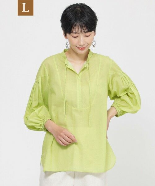 【L】【接触冷感】【ウォシャブル】シアーボイルプルオーバーブラウスこちらはラージサイズです。素材の軽さを活かした、エアリーで柔らかい印象ののシアーブラウスです。袖は程よいパフスリーブになっており、ふわっと軽い印象で、さり気ない透けが抜け感を演出するブラウスです。【素材】80番単糸の細い糸を使用した綿ボイルローン素材です。透け感のある薄手の生地ですが、強撚の糸を使っていることで、張りとコシがあるのが特徴です。清涼感がありサラサラとした手触りで、接触冷感機能付きです。(春夏展開商材)