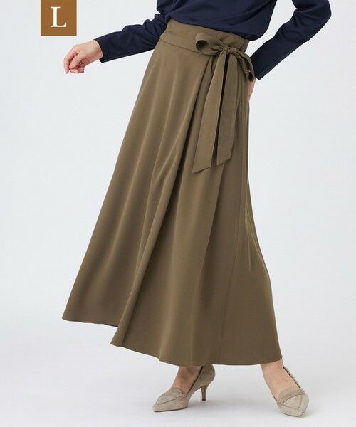ベルトノットデザインがポイントになっている巻き風スカート。シルエットは裾に向かって程よく広がるフレアシルエットで、トップスを選ばず活躍します。ベルトは取り外し可能なので、取り外してシンプルな巻き風スカートとしても楽しんでいただけます。