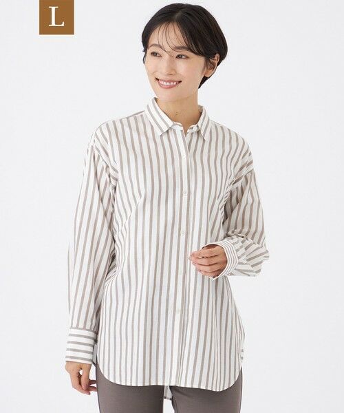 【L】【カタログ掲載】【ウォッシャブル】ジャカードラメストライプシャツこちらはラージサイズです。さりげなく輝くラメのラインがポイントのストライプシャツです。定番のシルエットで合わせやすく、さらっと着るだけでお洒落に決まる便利なアイテムです。1枚でも羽織でも、重ね着のインナーとしても活躍します。【素材】ベーシックなストライプ生地にさり気ないラメ糸を織り込み、上品な印象に仕上げました。さらりとした肌触りで快適な着心地が特徴です。(秋冬展開商材)