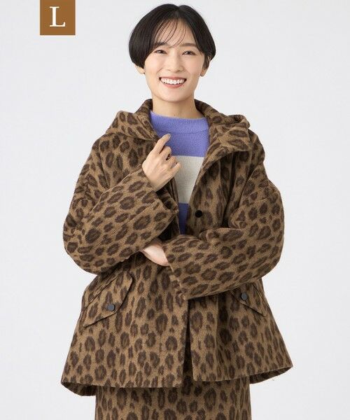 【L】【カタログ掲載】ウールパンサージャカードフーデッドコートこちらはラージサイズです。身頃の分量をたっぷりとったテントシルエットのウールコート。身体から離れるフォルムで、インナーを選ばず羽織ることができます。体型カバーとトレンド感の両方を叶えるアイテムです。【素材】ウールポリエステルのパンサー柄ジャカード素材です。EVEX by KRIZIAオリジナルの柄で作成しました。世界三大毛織物産地である尾州産の素材です。(秋冬展開商材)
