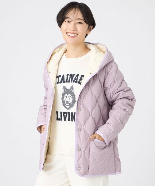 TAION×LIMONTA EAST×EVEX by KRIZIAのフーデッドキルティングダウンジャケット。カーディガン感覚で軽く羽織れるフード付ダウンジャケットです。金属ボタンがコーディネートのアクセントに。裏地にEVEXオリジナルのゼブラプリント生地を使用しています。腰が隠れる位のすっきりとしたフーデッドの形は、スカートともバランス良く着ていただけるシルエットです。優れた嵩高性のダウンを使用しているので、軽くて膨らみのあるダウンジャケットとなっています。アウターとしてはもちろん、アウターの中に着るインナーダウンとしても着用いただけます。