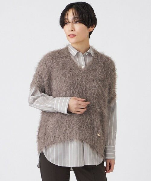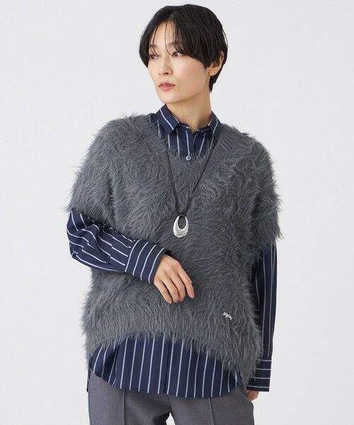 重ね着に便利なVネックのニットベスト。ふんわりとしたフェザーヤーンの表情が旬な着こなしに。手触りがくせになる毛足長めの柔らかなニットは、温かみのある素材感で、シャツやカットソーとレイヤードして、秋冬コーデのアクセントに。