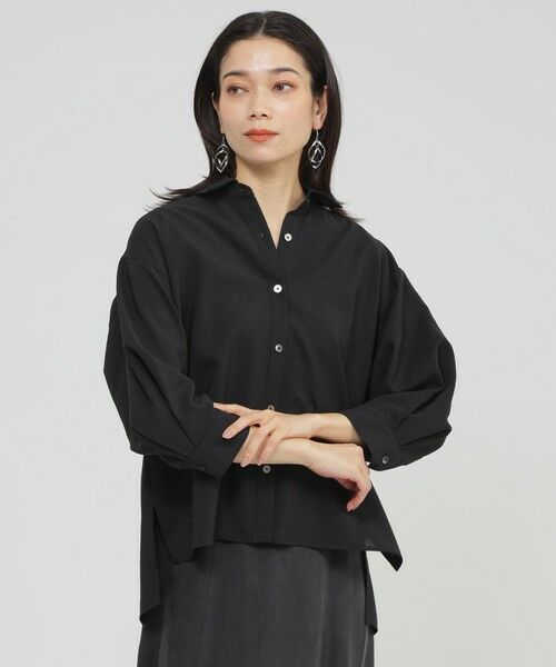 軽く羽織れるショート丈のブラウス。後ろは少し長めなので、安心感もある万能アイテムです。室内の冷房対策や、日差しの強い日の日除けにも使え、持っておくと便利な1枚です。後ろの方へボリュームが広がるように、タックの方向や分量を工夫した袖がポイントです。