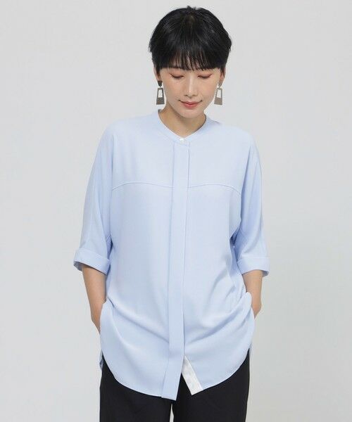 身頃から続いた袖が程よい抜け感のあるバンドカラーブラウス。カットソー感覚で着られる、ストレスフリーなつくりになっています。肘が隠れる袖丈で、長いシーズン活躍します。前立ての下前にブランドらしいパンサープリントで切り替えてあるのがポイントです。さりげない主張がオシャレな、1枚で決まる便利なアイテムです。