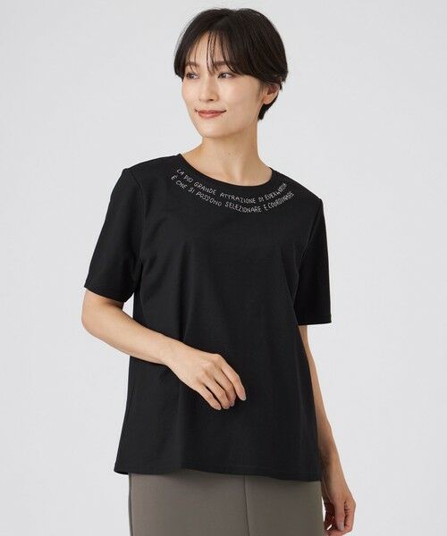【接触冷感】【ウォッシャブル】ネックエンブロイダリーカットソー定番のTシャツの中でも、特にすっきりとしたシルエットです。衿ぐりに沿って入れた、手書き風の刺繍がポイントです。内容は、フラッシャーネームにも書いてある言葉の一部で『EVEX by KRIZIAの最大の魅力は、自由にコーディネートを楽しむことです。』といったニュアンスの言葉が書かれています。【素材】適度な肉感で、白でも透けにくい50/2天竺素材です。ガス焼きバイオ加工による綺麗な目面、柔らかな肌触り、軽やかな風合いが特徴です。接触冷感機能付きです。※ブラック(09)は、オンラインストア・一部店舗限定カラーです。(春夏展開商材)
