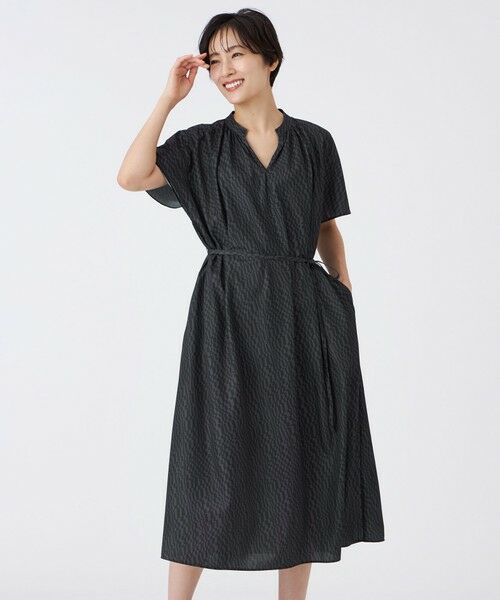 バンドカラーで衿ぐりにギャザーの入った、フレンチスリーブワンピースです。衿元からのギャザーが身頃、肩先にやわらかく広がっていて、衿ぐりが自然につながるVラインが胸元をすっきりとみせてくれます。紐がついているので、シャープに着こなしたいときはウエストを縛ってもらい、サックドレスとして着用したい場合は、紐をとってゆったりと着こなしたりと、2通りのシルエットを楽しむ事が出来ます。