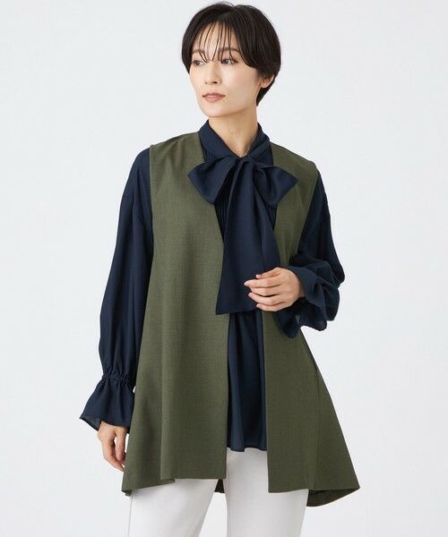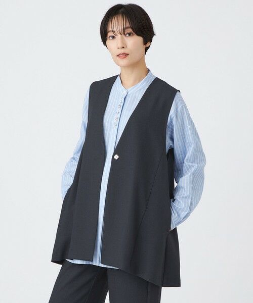 フレアが程よく軽さを演出したAラインのジレ。エレガントになり過ぎない、丁度良いバランスに仕上げた、フレア分量がこだわりです。ゆったりとしたトップスとも相性良くコーディネートしていただけます。Tシャツと合わせてもきまる、1枚あると便利なアイテムです。