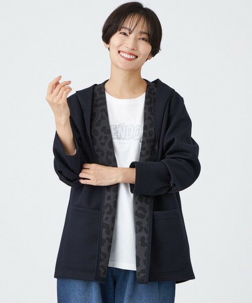 トーン×トーンのパンサー柄と、無地のリバーシブルフーデットコーディガン。大きく広がったフードの返りは小顔効果もあります。今年はパンサー柄が少し大き目になっていて、丈もミドル丈になっており、より着回しの良いアイテムに仕上げています。リバーシブル仕様で、コーディネートによって両面着まわせます。