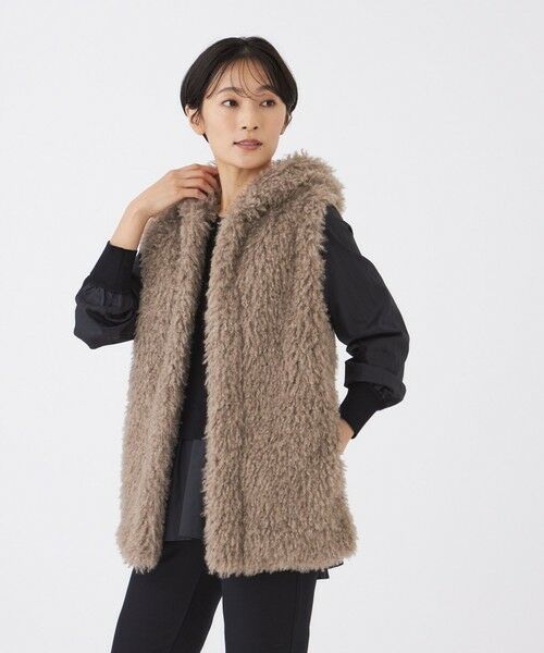 【カタログ掲載】ニットコンビエコファージレトレンドのファージレにフードをつけました。表情があり、手触りも柔らかなエコファーを使用。フードの程よいボリューム感で、顔周りを華やかに演出してくれます。シャツやカットソー、ニット、ワンピースなど合わせるアイテムを選ばずコーディネートを楽しんでいただけます。【素材】ファー部分には、生地の表と裏の両方からニードルパンチをかけたエコファー素材を使用。肌触りが良く、毛足がクリンとさせる事で表情が豊かになり、上質感と抜け感を兼ね備えた素材です。ニット部分は柔らかなアクリル糸を使用し、軽さにこだわりました。(秋冬展開商材)