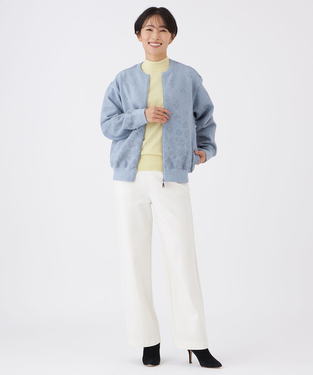 軽い着心地なのでさっと羽織りやすくデイリーにも大活躍、長いシーズン着用いただけるニットブルゾンです。国内有数のニット産地である、新潟の五泉地区工場の特殊な編み機を使用。立体感のあるタック編みにより、パンサー柄が独特な表現で編まれています。パンサー柄は、裾から上側に向けグラデーションでフェードアウトし、カラーもトーナル系でよりスタイリングしやすいアイテムにアップデートしています。